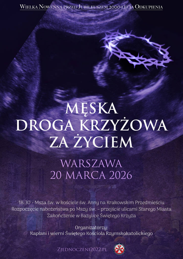 Podobnie jak w poprzednich latach, zapraszamy do wspólnej modlitwy podczas Męskiej Drogi Krzyżowej, która w piątek 20 marca przejdzie ulicami Warszawy.